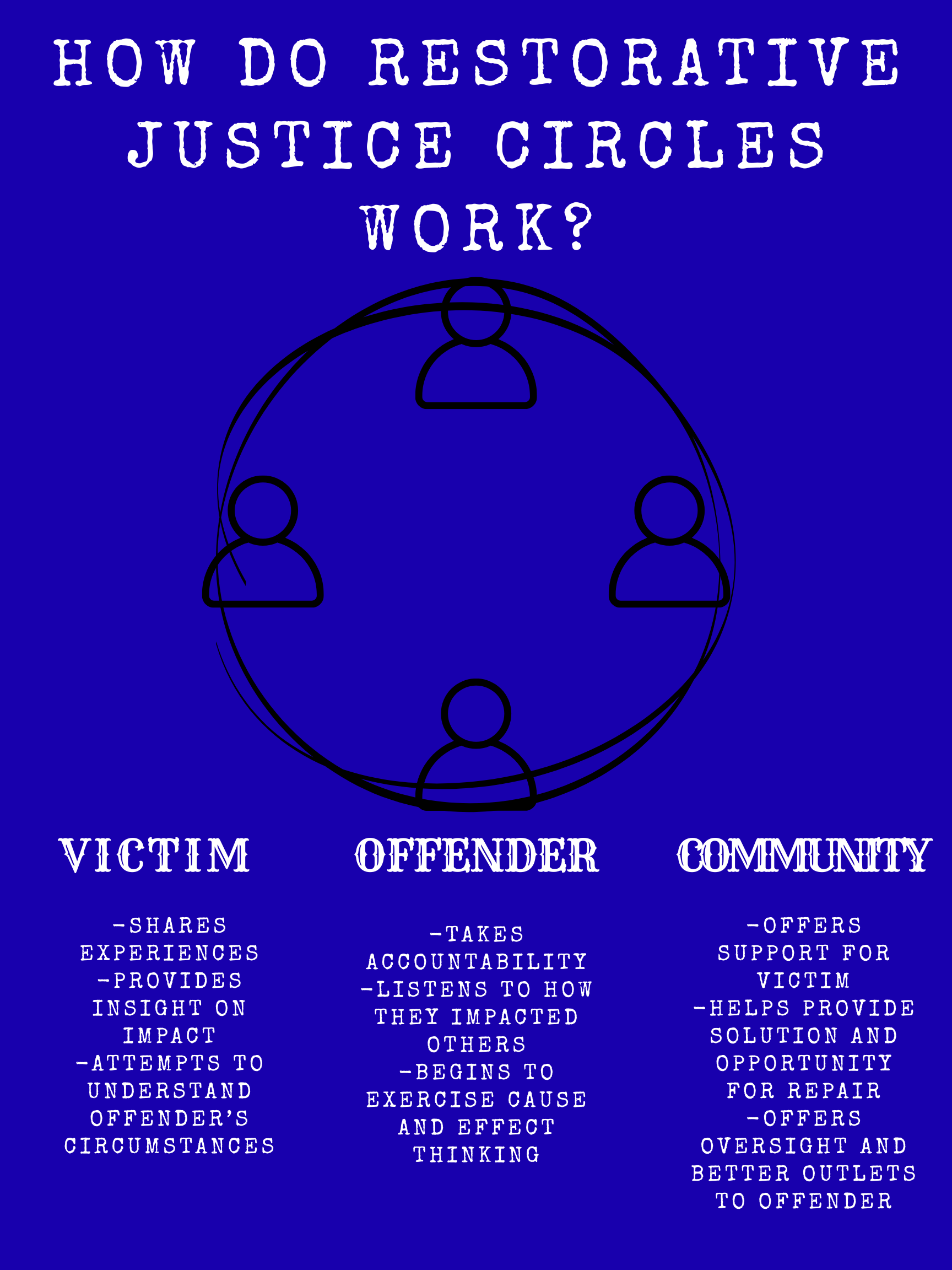 In the legal sense, restorative justice differs from formal court systems as there is more room and flexibility to take highly contextual aspects of each case and tailor solutions to help repair the harm that was caused. This process takes into account what the victim or affected parties would like to see happen to make things right, and focuses on the root problems that have led to offending and try to offer solution as to reduce the likelihood of reoffending. While restorative justice often leads to more meaningful outcomes for all involved parties, it can be more labour intensive, requiring more oversight, than other forms of justice. Simply, restorative justice seeks to repair while formal institutions have a stronger focus on punishment. Restorative process requires a high level of participation and sense of accountability from the offender, which means not every criminal matter is suitable for restorative justice, and in cases where the offender is unwilling to engage, traditional punitive measures are likely to be more appropriate.